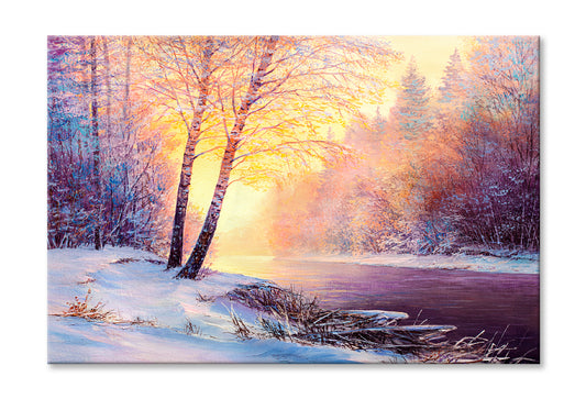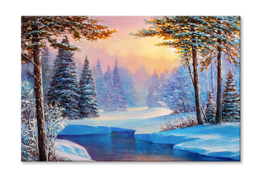 Winter Forest & A River Covered In Snow At Sunset Oil Painting Wall Art Limited Edition High Quality Print