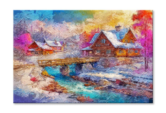 Winter Snow, Country Landscape. Log Houses. Bridge Over the River Wall Art Limited Edition High Quality Print