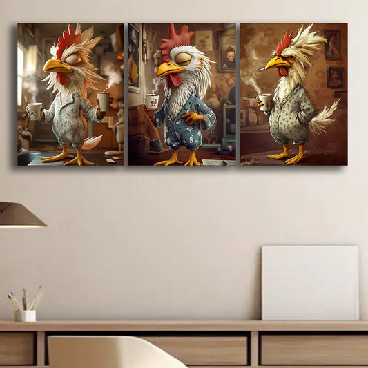 3pcs Tired Chicken with Cup of Coffee Classic Design Metal Print Ready to Hang Art