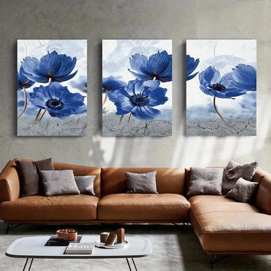 3pcs Blue Floral Abstract Modern Art Metal Print Ready to Hang Art