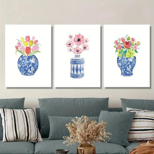 3pcs Watercolor Flowers in Chinese Style Vase Metal Print Ready to Hang Art