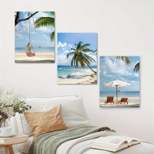 3pcs Coconut Palm Tree, Loungers & Umbrella Scene Metal Print Ready to Hang Art