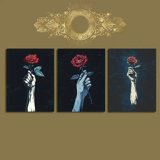 3pcs Red Rose and Raised Arms Handheld Floral Metal Print Ready to Hang Art