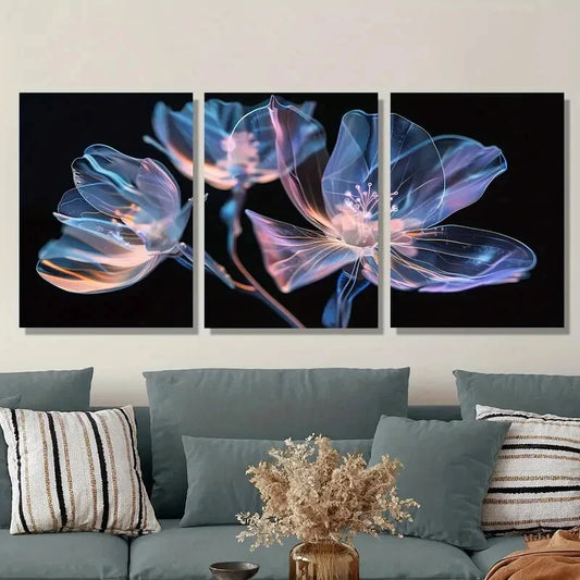 3pcs Vibrant Pink and Blue Crystal Flowers Metal Print Ready to Hang Art
