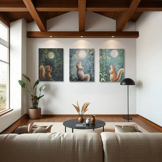 3pcs Whimsical Squirrel Moonlight Forest Metal Print Ready to Hang Art