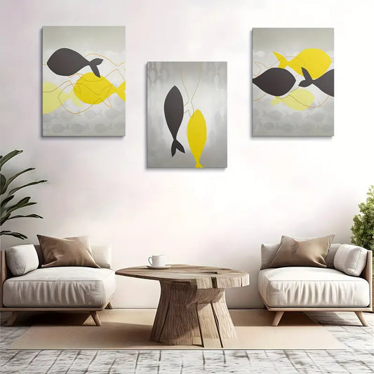 3pcs Geometric Fish Pattern Black and Yellow Metal Print Ready to Hang Art