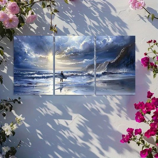 3pcs Ocean Waves and Surfer Oil Painting Metal Print Ready to Hang Art