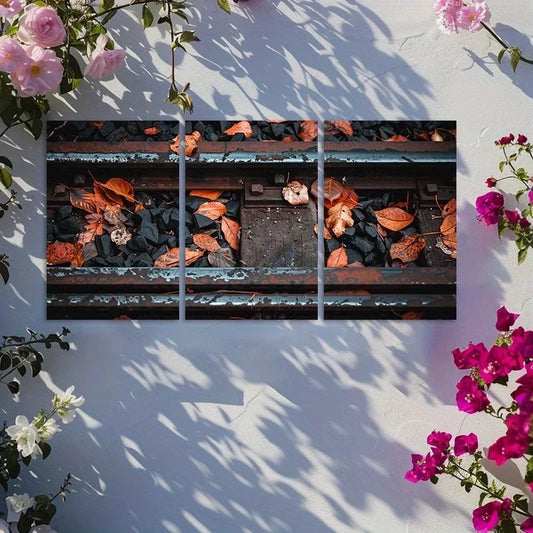 3pcs Old Train Tracks with Fallen Leaves & Rocks Metal Print Ready to Hang Art