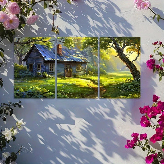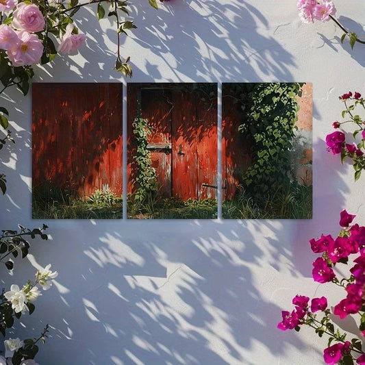 3pcs Rustic Red Wooden Cabin with Vines and Ivy Metal Print Ready to Hang Art