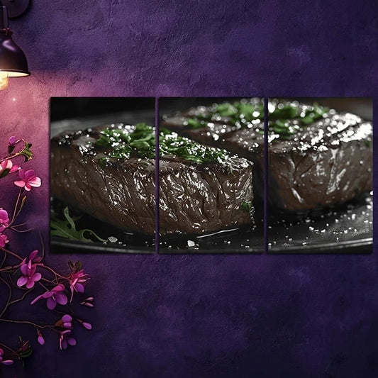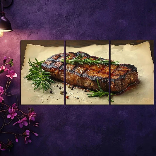 3pcs Steak with Rosemary Sprigs & Peppercorns Metal Print Ready to Hang Art