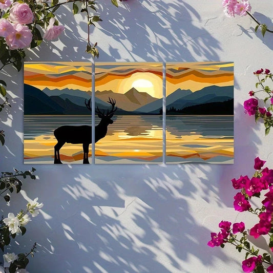 3pcs Sunset Deer and Lake Illustration Metal Print Ready to Hang Art