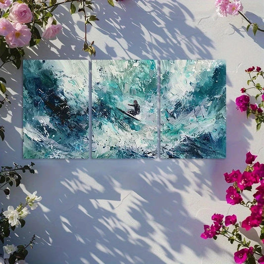 3pcs Surfer Wave Action Oil Painting Metal Print Ready to Hang Art
