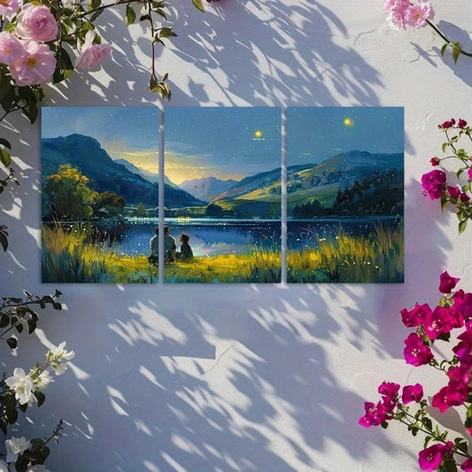 3pcs Oil Painting Style Landscape with Couple Metal Print Ready to Hang Art