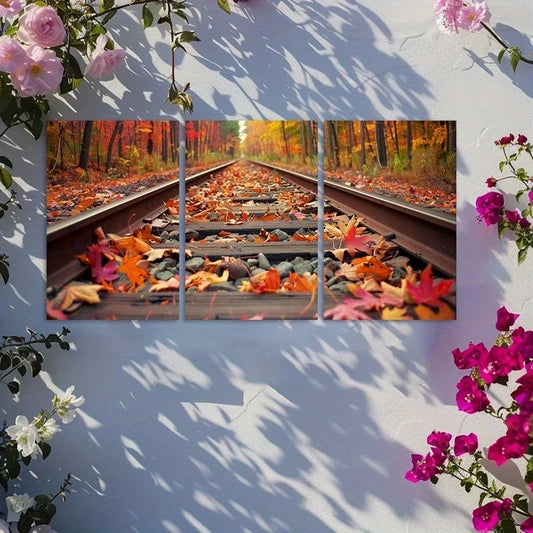 3pcs Fallen Leaves and Rocks on Railway Track Metal Print Ready to Hang Art