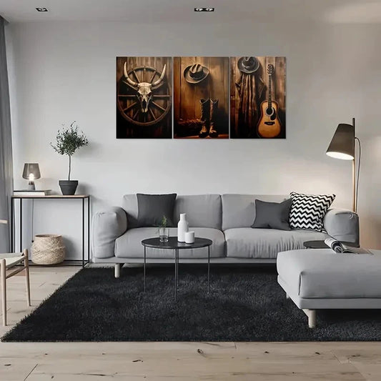 3pcs Hat Boots Guitar and Bull Metal Print Ready to Hang Art