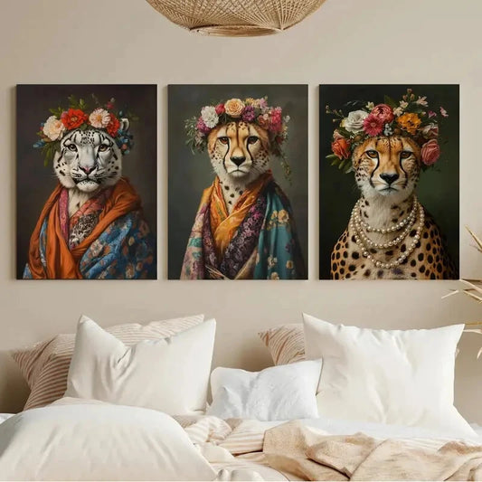 3pcs Animal Flowers in Kimono Cheetah Metal Print Ready to Hang Art