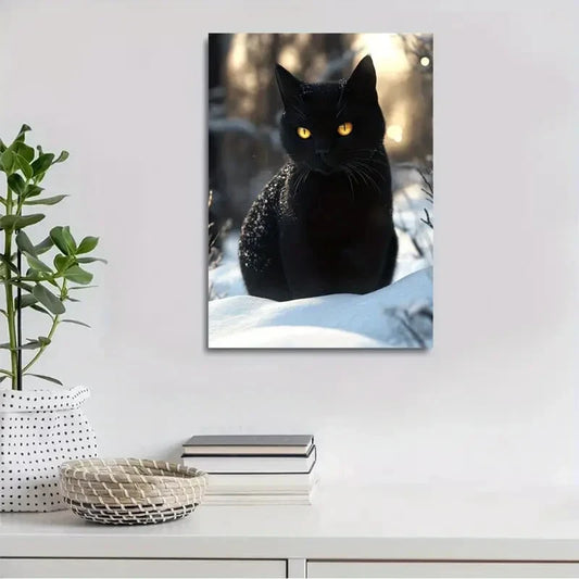 Beautiful Black Cat On The Snow Painting 40x60cm Metal Print Ready to Hang