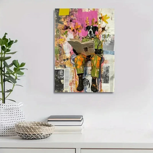 Featuring a Pet Dog with Paws Reading Newspapers 40x60cm Metal Print Ready to Hang