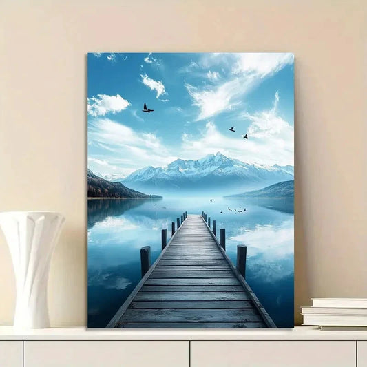 Wooden Bridge Leading To The Lake, Blue Sky And White 40x60cm Metal Print Ready to Hang