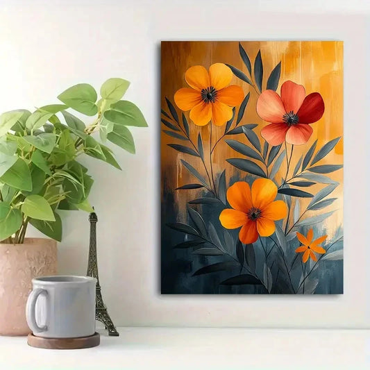 Beautiful Vibrant Orange & Red Floral Design Painting 40x60cm Metal Print Ready to Hang