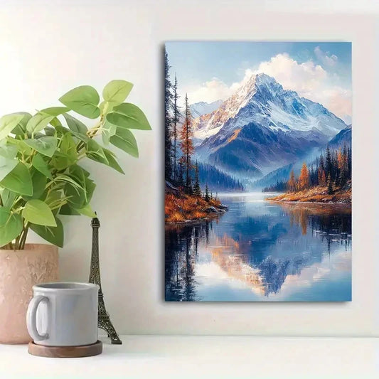 Beautiful Serene Snow Covered Mountains Painting 40x60cm Metal Print Ready to Hang