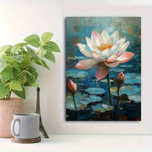 Beautiful Serene Blue & Pink Water Lily Painting 40x60cm Metal Print Ready to Hang