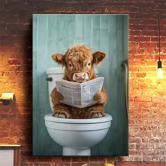 Whimsical Calf Reading on Toilet Metal Print Ready to Hang
