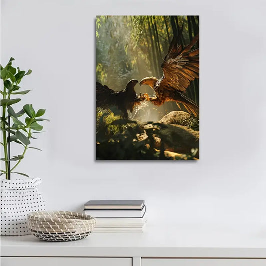 Steampunk Eagle Wrestling Scene in Bamboo 40x60cm Metal Print Ready to Hang