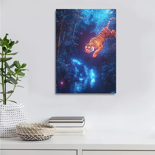Tiger Swinging in Bamboo Grove with Neon 40x60cm Metal Print Ready to Hang