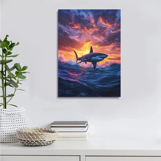 Cyberpunk Shark Waterfall Scene with Sunlight Painting 40x60cm Metal Print Ready to Hang
