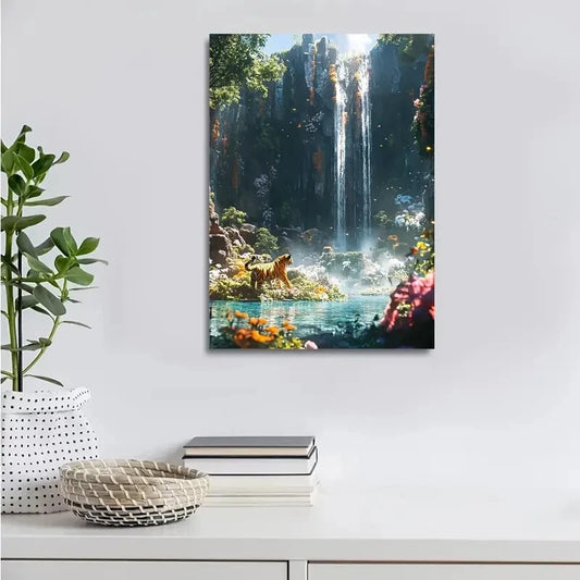 Cyberpunk Tiger Dancing Under Waterfall Painting 40x60cm Metal Print Ready to Hang