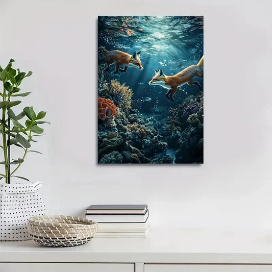 Whimsical Underwater Fox Scene Coral Reef Painting 40x60cm Metal Print Ready to Hang