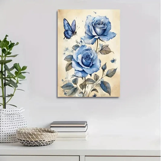 Beautiful Serene Blue Roses & Butterflies Painting 40x60cm Metal Print Ready to Hang