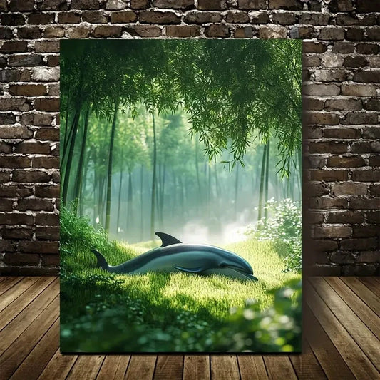 Dolphin in Bamboo Grove Scene with Morning Painting 40x60cm Metal Print Ready to Hang