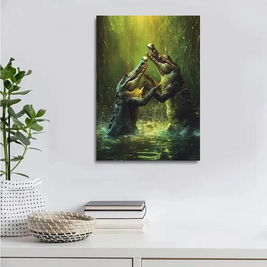 Vibrant Crocodile Wrestling Scene in Lush Painting 40x60cm Metal Print Ready to Hang