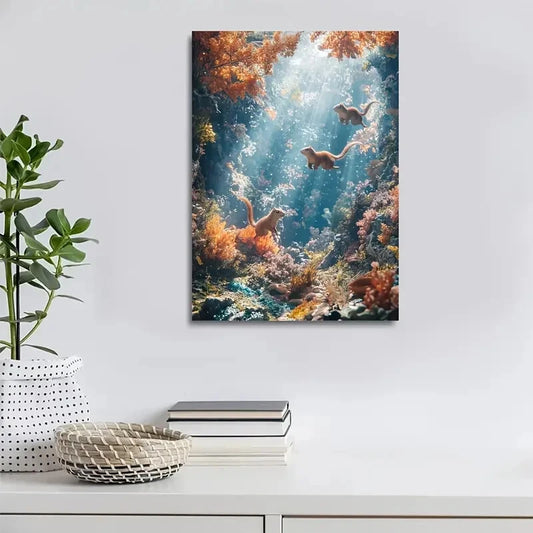 Coral Reef Scene with Squirrels Sunbeams Painting 40x60cm Metal Print Ready to Hang