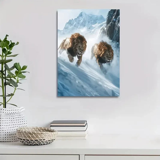 Scene Of Lion Chasing Each Other Painting 40x60cm Metal Print Ready to Hang
