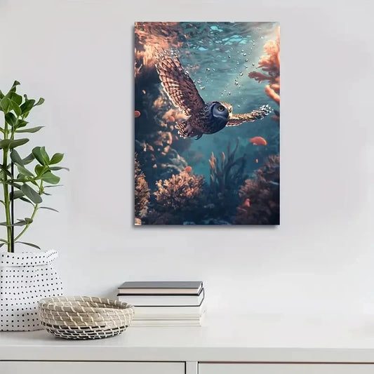 Scene of Owl Jumping Joyfully Underwater Painting 40x60cm Metal Print Ready to Hang