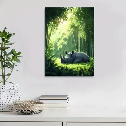 Cartoon Rhino Rolling in Bamboo Painting 40x60cm Metal Print Ready to Hang
