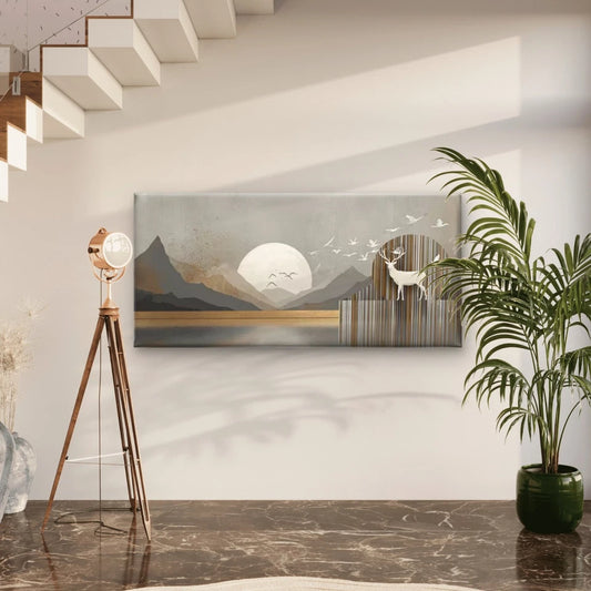 Minimalist Mountain Lake & Deer Wall Art Canvas Office Home Room Framed 120x60cm
