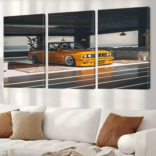 3pcs Retro Minimalist Vintage Yellow Sports Car Wall Art Set Canvas Framed 50x70cm - High Quality Print 100% Australian Made Wall Canvas Ready to Hang