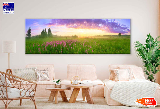 Panoramic Canvas Blossoming Meadow Sunset With Flowers High Quality 100% Australian Made Wall Canvas Print Ready to Hang
