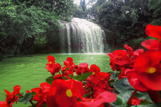 Red Flowers Near Waterfall Scenic Home Decor Premium Quality Poster Print Choose Your Sizes