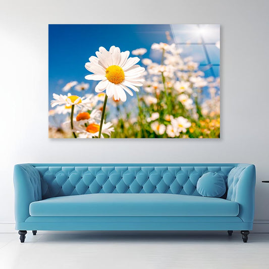 Summer Field With White Daisies on Blue Sky Acrylic Glass Print Tempered Glass Wall Art 100% Made in Australia Ready to Hang