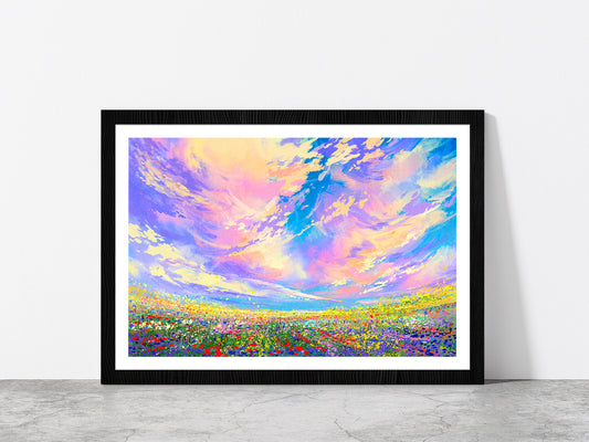 Colorful Flowers In Field Under Beautiful Clouds Glass Framed Wall Art, Ready to Hang Quality Print