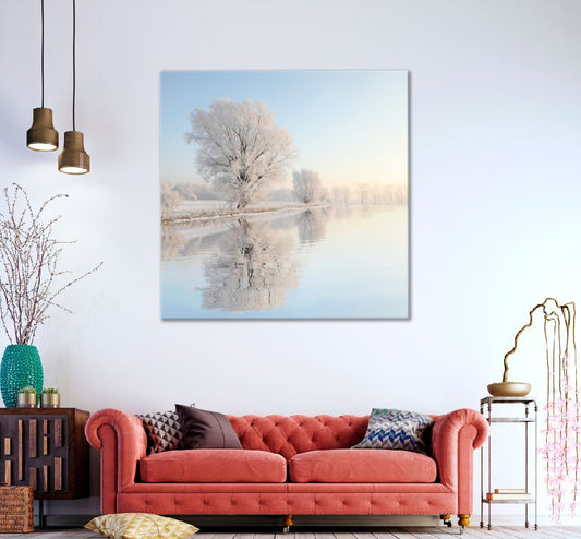 Square Canvas Snow Trees & Lake View Photograph High Quality Print 100% Australian Made