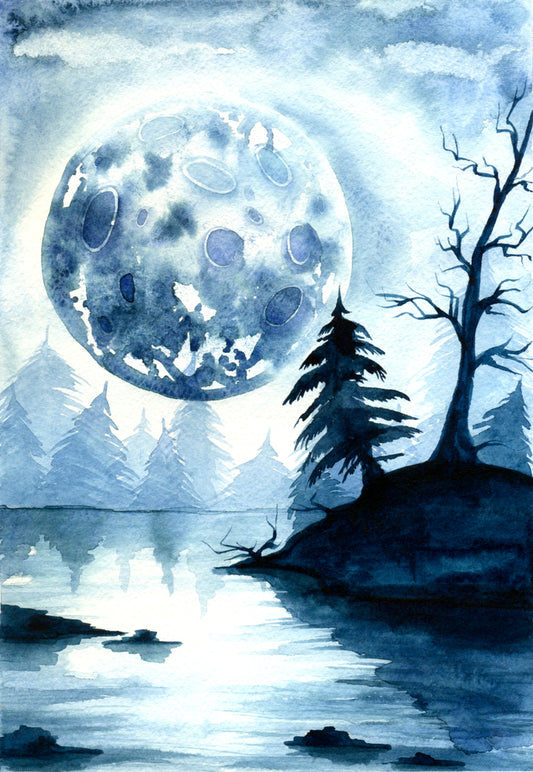 Watercolor Dark Forest Landscape with Moon Painting Print 100% Australian Made