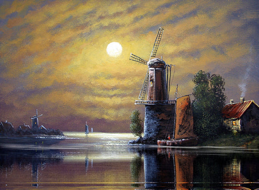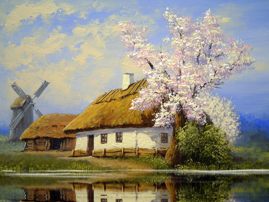 Village Houses & Windmill With Flower Trees Painting Print 100% Australian Made