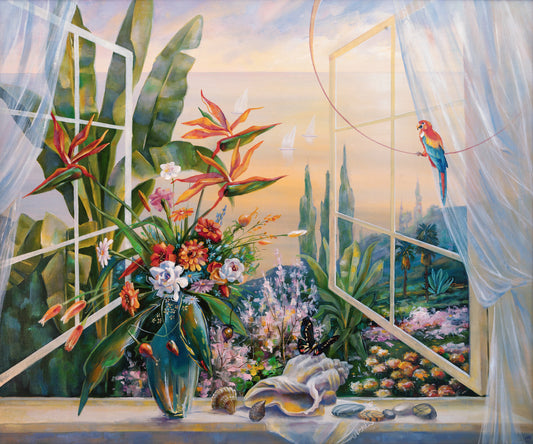 Opened Window Parrot Flowers & Plants Painting Print 100% Australian Made