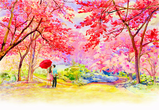 Couple Near Red Flower Tree Forest Painting Print 100% Australian Made